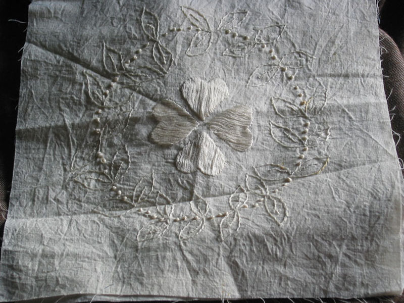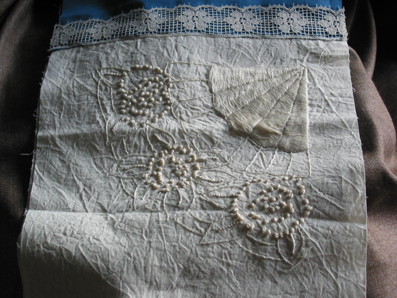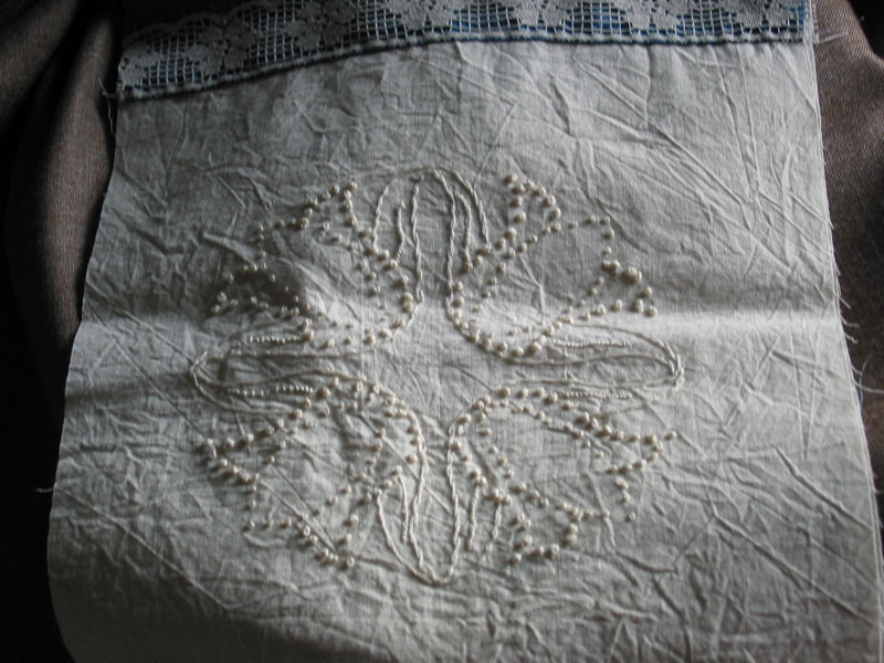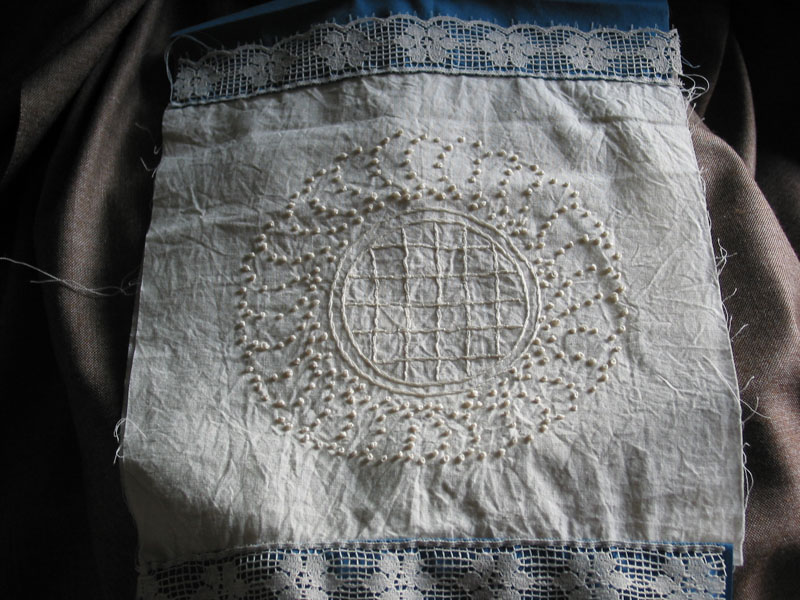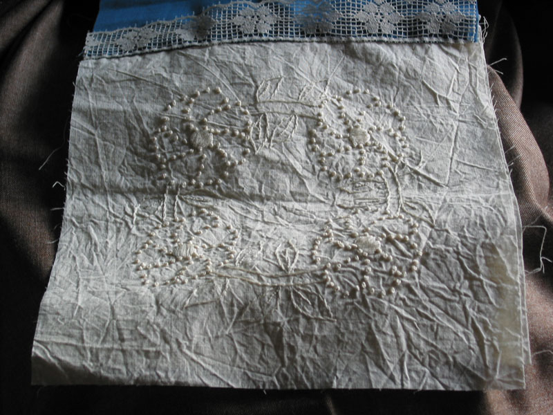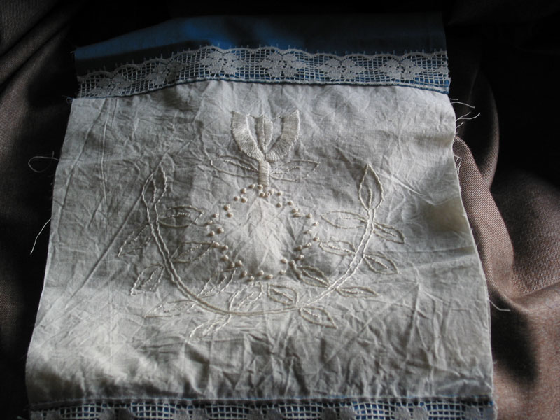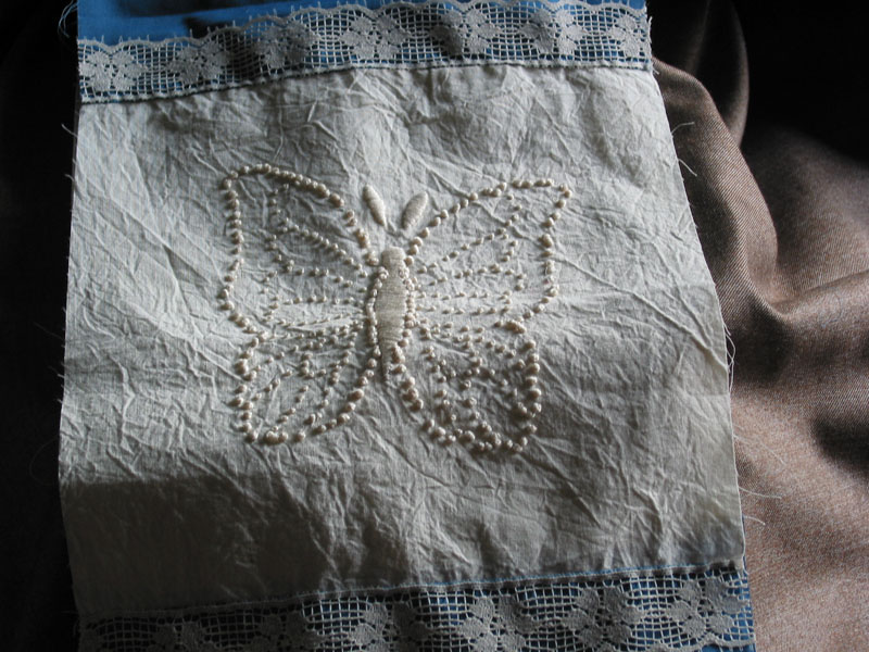 This quilt is one that I started about 1988 or so....it would have been finished by now if my sewing machine hadn't fell off the truck on one of my last moves. You will see some blue in some photos...all I have left to do is to sew the 3 panels together with blue strips and add the lace. Then it will be a quilt top.