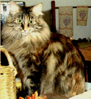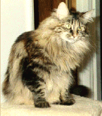 Olivia was born on January 16, 1996 and she was delivered to me by the breeder on April 9, 1996. Well enough about Olivia and on to what you came here for. I will try to give a little information about the Maine Coon cat. I am not a breeder nor do I show Olivia, but in my eyes she will always be the most beautiful of any cat on Earth !!!