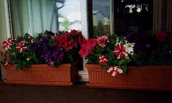 My husband and I went out and bought two rectangular window sill boxes for some flowers. I decided on petunias. We also bought two hanging plant holders. We put petunias in one and a variety of mixed flowers in the other.