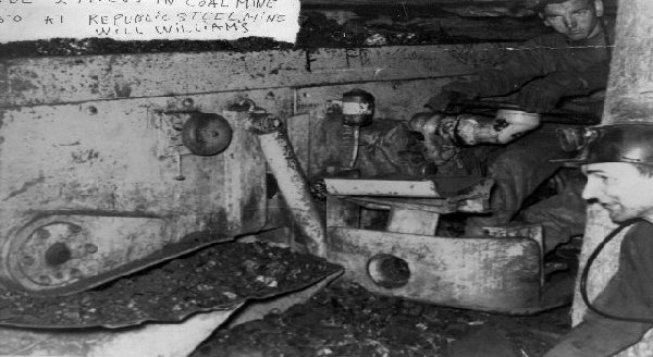 This picture was taken 2 miles underground in Republic Steel Coal Mines at Road Creek, Kentucky. It was taken in 1950 - the year I was born. My Dad (in the lower right side of the picture) was head electrician at Road Creek. The machinery he is pictured with is a continuous miner. I do not know the identity of the man he is with. The music you hear is Sixteen Tons.