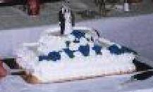 Was held right after the ceremony at the same location Dancing began right after dinner and went on into the wee hours of the morning. Our first dance was 'Don't wanna miss a thing' by Aerosmith. Our cake was a beautiful two layer cake. There was a vanilla slab on the bottom and a chocolate heart sized cake on top of it. The cake was topped with white icing, navy flowers and the traditional bride and groom topper. I believe everyone had a great day and we have a beautiful videotape to remember it by.