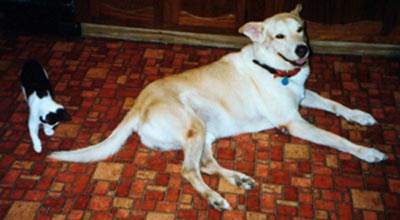 I'm Max, I belong to Josey's Uncle. These are pictures of me attacking water from the hose and then there is the one with that kitty....he doesn't know good kitties run from dogs, not attack their tails.