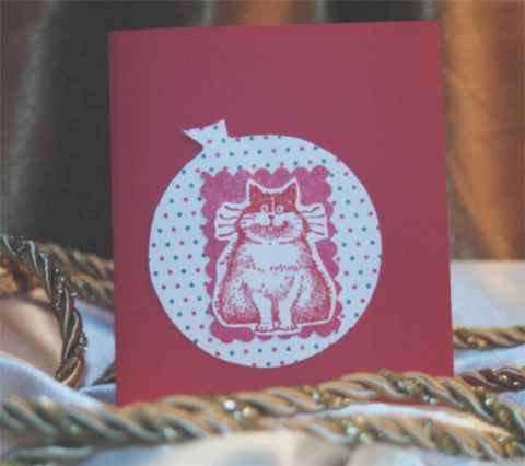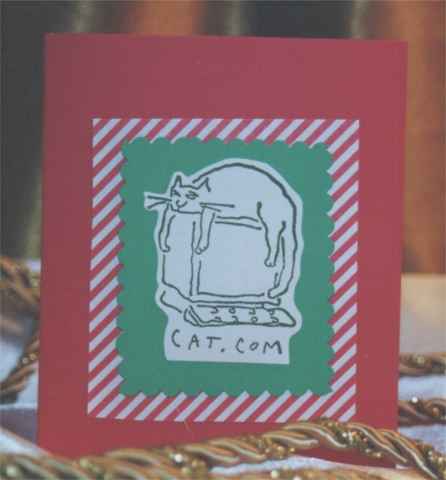 Item # 100-ccom. Red paper card with red & white striped background. Cat picture set on solid holiday green backing. Cat is stamped in holiday green ink on white paper. White envelopes have green paws on the front. |