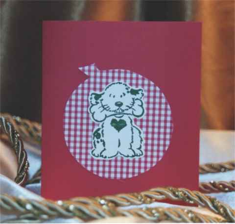 Item # 100-db. Red paper card with checked ornament and puppy with bone. Puppy is stamped in holiday green ink on white paper. All paper is acid free. White envelopes have green paw prints on the front. |