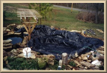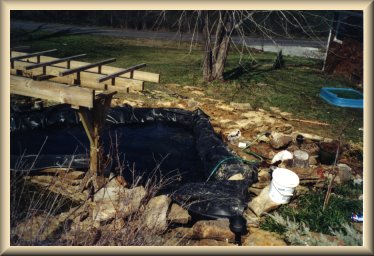 Day 2 and thank goodness the rain has stopped. I used my old liner as protection for the new. I have used all the excess liner I could to protect the liner from the rocks I will be putting on top. The ground is almost pure clay in the bottom so I am leaving that as is.