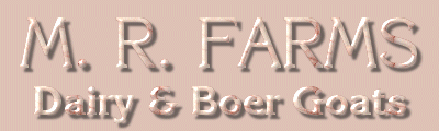 | Hello, welcome to M.R. Farms Dairy Goats and Boer Goats. My name is Marcia Rooney and I live with my husband, Philip, and son, Matthew, in Upper Lake, California. We are just off Hwy 20, between Hwy. 101 and I-5, near the Mendocino National Forests. We have been raising and showing dairy goats since 1995.. We began with our first purebred Nubian, that we purchased from Lakeshore Farms. Megan and Kristine Tredway have been wonderful mentors, helping us along the way. We now currently have Nubians, as well as Alpines, with our numbers totalling around 30 goats. We have many thank-yous to several folks who have helped us along the way with quality animals. We are present for all our births, and raise our kids on heat- treated colostrum and pasteurized milk. We will be offering animals for sale this year. Please feel free to browse. If you see something that interests you, or require further information, don't hesitate to contact us.. We have been attending shows this year (2003) and have some new photos to get added to the site as well as show stats. Our Limo kids as well as Laredo kids are doing well in the Nubian classes. As well as some of our Alpines. Please check back for further updates. Thanks for stopping by! |