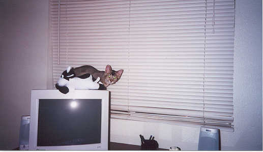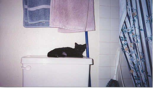 June 6, 2000 Well, I got a foster kitty yesterday. He is black, DLH with green eyes. He had really bad fleas and only weighs 1 pound and 8 oz at the moment. After getting a bath, he seems to feel much better and is starting to eat. I have foumd that he likes to lay on top of my printer and watch me on the computer. I think I will name him Icon. I sure hope he starts to grow. He is so thin it is scary. Will have pictures and updates soon