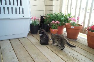 All three were taken to the vet to be tested and altered.When I got them home I kicked Antonioout of his hutch(good thing he is litter box trained!)and put moma cat and her babies in to live for a couple days while they healed from their trip to the vet.I soon found that mom was too wild to try to tame but her babies seemed to be workable.I get mom go after 3 days.She surprized me by not going bonkers to get outside right away when I let her get out of the cage.She in fact was surprizingly calm.She just hung out for a couple hours before she made her way to the window that I had opened for her to go out.She comes back every night to eat the food I leave out for her.