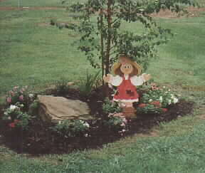 This is one of my most recent flower beds. The white birch is very young. Jim and Sandy gave it to me last year. We had a flood this year much worse than the 1996 flood. It was time for another face lift in my yard. I made the wooden girl...and her name is Carrie. :-)