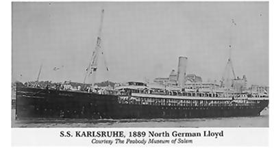 The "Karlsruhe" was built by Fairfield Co Ltd, Glagow in 1889 for North German Lloyd (Norddeutscher Lloyd) of Bremen. She was a 5,057 gross ton ship, length 415ft x beam 48ft, straight stem, one funnel, two masts, steel construction, single screw and a speed of 13 knots. (About 15 miles per hour.) There was accommodation for 44-1st, 36-2nd and 1,955-3rd class passengers.