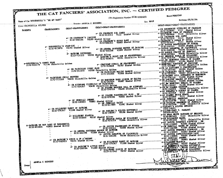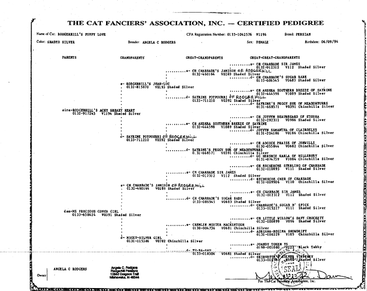 This girl is a bundle of energy. She is constantly on the go. She loves to climb and always seems to find herself on the highest shelf of our cat tree. QT is always around, she follows you up and down the satirs, like a puppy dog. Her father is Pykov. She was born March 1998.
