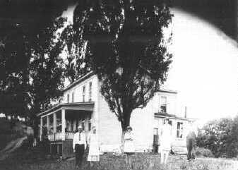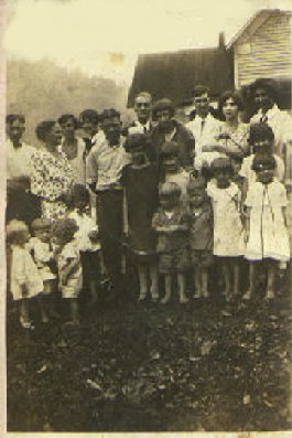 The Morris Home in Wileyville, Wetzel County West Virginia.  From left to right:  Anthony T. Morris, Mary Christine SEES Morris,  Eleanor Emma Haught, Mary Christine Haught,  William Morris, and up in the far back bedroom window is Mary Pauline MORRIS.