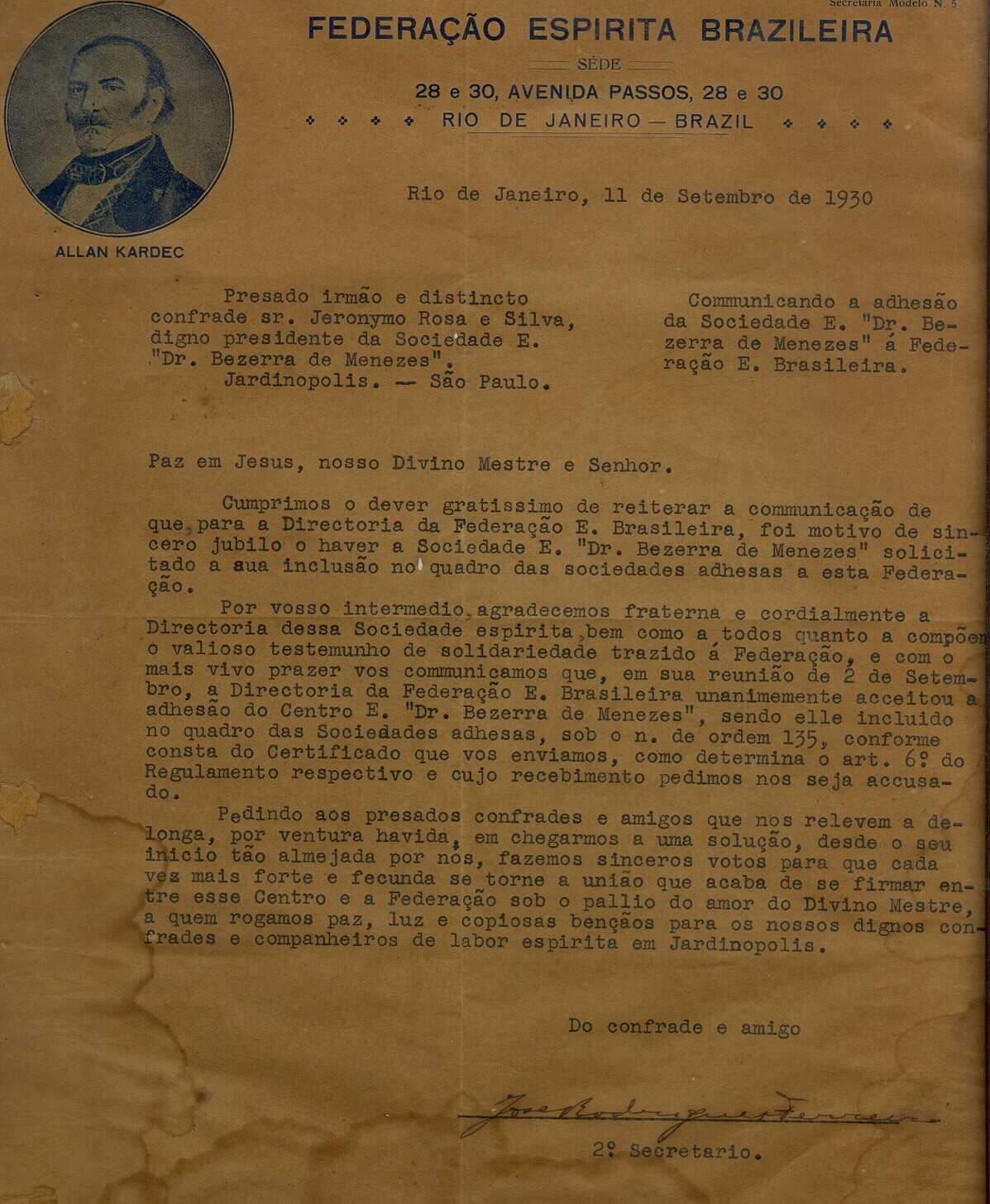 - Termo de adesão à Federação Espírita Brasileira em 11 de setembro de 1930 -