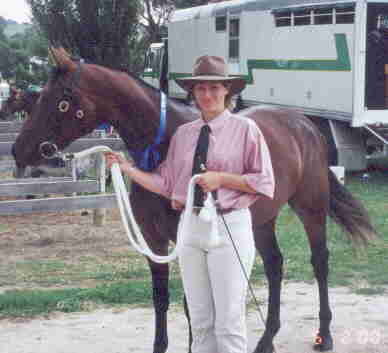 Perhaps foaled a lovely bay colt to Orion in October, 2001 - called Banjywon Egan who has been sold for future show jumping, and is now back in work. She has proven once again that her temperament is outstanding by stepping back under the saddle without so much as a snort after nearly 18 months out of work. Narelle Elsum is showing her with good success and great enjoyment.
