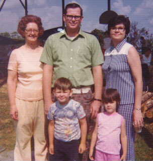 This picture was taken in 1976. The adults from left to right are: Lutishie Duncan Logsdon (daughter-in-law of Ann Eliza Polston Logsdon), David Logsdon (grandson of Ann Eliza Polston Logsdon and son of Lutishie Duncan and Jettie Logsdon), and Ann (Wife of David Logsdon). The children are Joel Logsdon and Krista Logsdon (great grandchildren of Ann Eliza Polston Logsdon, grandchildren of Jettie and Lutishie Duncan Logsdon, and children of David and Ann Logsdon.)