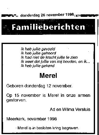 Merel werd geboren na een zwangerschap van 40 weken en 6 dagen in het Sophia kinderziekenhuis te Rotterdam. Ik werd daar met spoed naar toe gebracht omdat ze had gepoept in het vruchtwater en ze een vrij strakke hartslag had. Ze kwam met de keizersnee, ze kwam heel erg ziek op de wereld. Later bleek dat Merel zuurstof gebrek heeft gehad wat een spasme heeft veroorzaakt in haar hersenen wat ze niet meer konden stoppen. Drie dagen later hebben we afscheid van haar moeten nemen.