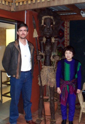 Posing next to an Aboriginal artifact with Mirs Ohira, fellow judge from Japan (TICA) in Perth, Western Australia - July 1999. |