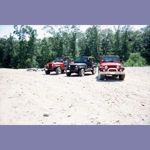 The red CJ on the left is my second Jeep, the Chevy 350 one. The middle YJ is my friend Hall's Sahara. That newbie over there on the right is my friend JT's 1998 TJ - It's damn nice.
