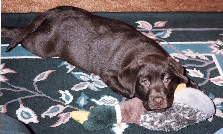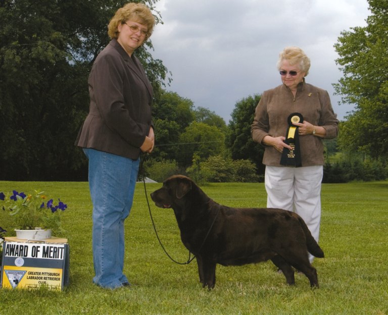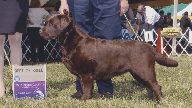 Ginny is our chocolate girl from respected breeders/judges Mary and Michael Wiest of Beechcroft Labradors. Thank you Mary and Michael for such a lovely young lady! She is a pleasure! Ginny finished her championship on September 10, 2006 under breeder/judge Nancy Arbuckle, Hunt Club Labradors. Thank you Nancy!Accomplishments: LRC of the Potomac Specialty - April, 2003 2nd - 6-9 month choc., reg. & sweeps