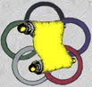 scroll overlaying five conjoined circles, the circles being red, blue,