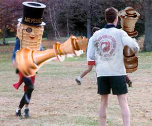 See Mr. Peanut stumble about the field? Why you ask? He's lost his other eye glass thing and thought perhaps it is on the field. One problem however, Mr. Peanut lost his other eye glass thing 21 years ago. he hasn't stopped looking for it either. Bad eyes? What's next? The poor peanut is falling apart.
