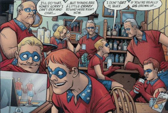 First Appearance: Buzz Brandon, Tommy Tompkins, Pudge O'Conner & Tip Adams – Startling Comics #16 History: The original Four comrades consisted of juvenile boxing prodigy Buzz Brandon, wealthy child inventor Tommy Tompkins and street urchins Pudge O’Conner and Tip Adams. During WWII the Four Comrades fought crime on the home front. When the alien menace invaded Earth in 1969, it imprisoned many science heroes in suspended animation above the planet. The Four Comrades did not face the alien invader, but were left to deal with the after affects. They did their best to cope with the growing criminal element due to the lack of science heroes. Any attempts they made to stop the alien menace were nullified. During the thirty years before, Tom Strange and his counterpart, Tom Strong, freed the other science heroes and defeated the alien threat, Tip was killed saving the life of his sister, “Tipper”. Tipper would replace her brother on the team…in his honor no doubt. As the team grew older they opened a bar in Invertica City, properly named “Comrades”. The Four Comrades were in Invertica City when the science heroes returned to Earth. Buzz, Tommy, Pudge and Tipper continue to own and manage the bar now that they’ve retired from the hero business Note: After three years from the defeat of the alien menace a new crisis griped the Earth. A widespread time anomaly caused by an unconscious Captain Future brought past and future people and events into the present. Before it ended Buzz. Tommy, Pudge and Tipper encountered a time displace version of the original Four Comrades with Tip still alive. Old wounds thought healed were reopened. Powers: None. All members were athletic and skilled in hand-to-hand combat. |