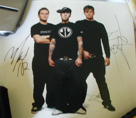 | there by. But I eventually found Steve, and he led the whole pack of people (which wasn't very big, which was cool) to where we were all gonna meet Mark, Tom, and Travis.... I must say that they are all REALLY nice guys. The coolest of the three bands I've met. No pictures were able to be taken, though. But I got my copy of Enema Of The State signed by Tom DeLonge and I got a shirt signed by Tom DeLonge and Mark Hoppus (Travis was too quick fer me) for Tom (the other guitarist in my band). Mick and I also both got a promo flat that all three of 'em signed for us. Too cool. I was finally able to tell Travis Landon Barker that I thought he was the Lord and Savior of all things percussion... He looked like he appreciated that and said thanks. I told |