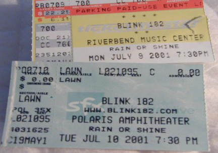 | shitty seats, so we were attempting to get closer seats... Flash to about two weeks before the concert... Two Saturdays, actually, but anyway... I'm at Mick's house, we're chillin', and I walk into his room, which has the radio on. Some sound-byte/clip thingy that is a medley of Blink songs plays between a song, and I ran to the phone, not even knowing before I heard it at that moment that WXEG (the station that was playing) was having a contest for Blink tickets. I started dialing on the phone in Mick's kitchen... When I got a busy signal, I hung up and I couldn't find the redail button on Mick's phone, so I maually dialed again... And again... And again... And I finally heard a ring. And what caller was I? I was the 10th Caller.... And do you know what that meant? That meant I got TWO TICKETS TO SEE BLINK-182!!!!!!!!!! Unknown to me at the time, they were for the Columbus show the night after the Cincinatti show. I thought I had won those better tickets that Mick and I were trying to score... But no matter... I was also entered into a drawing for BACKSTAGE PASSES to the Colubumbus show! I had to wake up early that Monday, and listen for my name during the morning show... And I did wake up early. They were drawing the first name at 7:15 am, and I woke up at 6:30. Waiting and waiting... And they finally drew the first name... It was not me... But they did not call in within the amount of itme they were supposed to... Same witht he next name they drew.... And the next one.... And the next one.... THEY DREW TEN NAMES BEFORE MINE!!!!!!!!!!!!!!! AND I GOT THE PASSES!!!!!! HELLS YEAH!!!!!!!!!! |