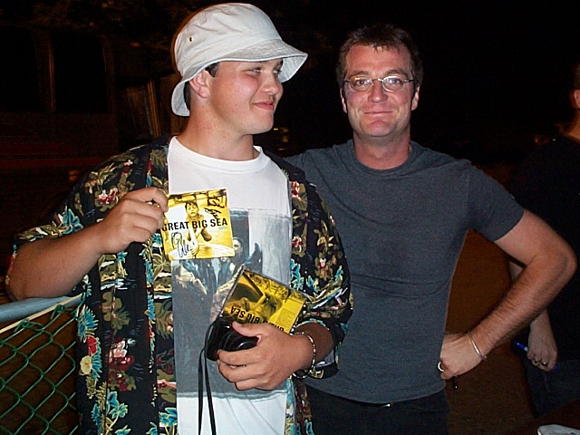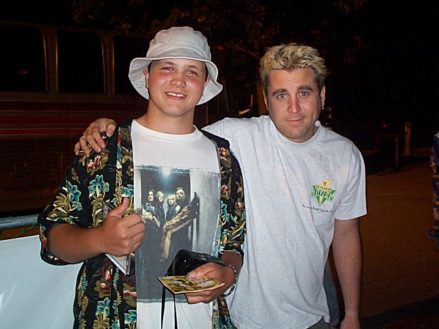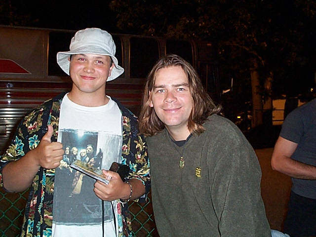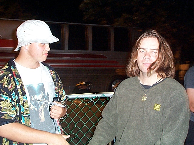 | metal statue-like thingy. Karen and I STILL don't know what it was supposed to be... But, anyway. Good tunes were played and good times were had by all... Especially two lucky teenagers. Afterward, though, Karen's mom was mighty annoyed at us. You see, when we began our walk around the premisis, we were actually supposed to pick up something and bring it back to Karen's mom It was AFTER the show that we remembered to do this... And my dad reminded us as he was going up the huge hill that we were going down. But after we got the items, and got down to where you can meet the band and all that, all was forgiven by Karen's mom. She was able to meet the member of the band that she hadn't met yet (Bob Hallett, the fiddle player... And he plays other things that don't exactly jump to mind), and she was happy. As were Karen and I. As you can see I met the band after the show |