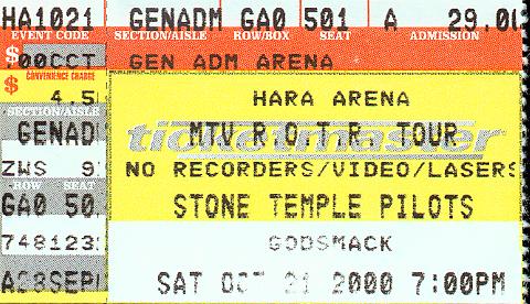 | care. Rich was the only one that didn't see Godsmack. He's lucky. They were ABSOLUTLEY HORRIBLE!!! Sully Erna (the lead singer) needs to be smacked around... A LOT. Basically, he just wanted to prove that he's just so edgy because he can say DIRTY WORDS. He actually said the following during a interlude (an unnecesarilly long one, too)... And I (semi)quote... "I've got a message for all those disco fucks that think rock is dead... You all might wanna join me...... (yelling) FUCK YOU!!!!!!!!" If I remember correctly, he also threatened to "beat the shit" out of a chick that was sitting down while they were playing. That alone just showed me a complete lack of class on his part. I was waiting for them to play one song... "Whatever." Why? Because I knew it'd be their LAST song!!! And they'd get off the stage to let the TALENTED band get on. Finally, they were done, and my brother and I snuck onto the floor where my brother's two friends were. After a while, the giant star/projection screen for STP was raised and the next Led Zeppelin took the stage. Scott Weiland is, possibly, one of the greatest frontmen EVER! This guys knows what the fans want. Comedic (in disturbing ways sometimes.... He gave Dean DeLeo, the bassist, a lap dance. Afterward, he just casually stated, "I find nothing wrong with one married man giving another married man a lap dance."), energetic, and everything a frontman SHOULD be. Very active. Did a lot of belly dancing and schtuff like dat. Robert DeLeo, at one point in the show didn't approve of the way one of the security guards was treating the fans. Started kicking him and spitting at him. Yelling, giving the finger and stuff. Scott went next to him and said "there's always an asshole that has to fuck things up for everyone else... And the asshole's wearing a yellow shirt." (Yellow is the color of choice for the security guards at Hara Arena) No problems from there on out. I helped a lot of people get up to crowd surf... Got VERY close the the stage... Cringed when Scott wrapped himself in the American flag and nothing else... Scott was BUCK NAKED under the flag. The Acoustic set was very good... (as you can see, I'm just typing the thoughts about the concert as they come to my head) VERY tight band. Like I said... They're the next Led Zeppelin. They HAVE to be good. :) On the way home, many jokes were made at Weiland's expense... Like, how Christmas and Thanksgiving is like at the Weiland household... His kicked heroin addiction... Lots of laughs... But it was an EXCELLENT concert... Surprisingly, I enjoyed it immensely considering what happened before I left to go. But I will not tell you all about that. Anyway.. I thought so highly of this concert, I'm postin' live pics of the whole band. Enjoy! :) |