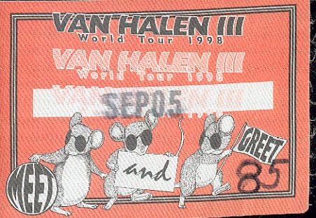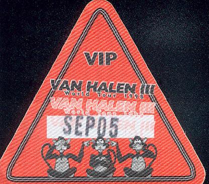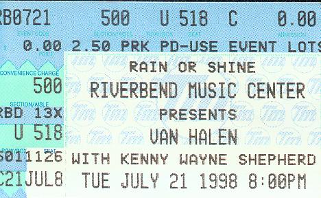 | (Michelle) both of whom, like me, had never seen Van Halen live. So the Knights picked me up and we would've been all peachy-keen... But the crotch of my jeans ripped apart right when I sat down in the car. Well, after that setback we were ready to go. First, because I was their VH connection, they treated me to dinner at T.G.I. Fridays... And I got a glimpse of the inside of Gary Knight's house... The amount of records and cds he has is incredible... Anyway, we got this certain card that Michelle uses at Friday's and into the restaurant we walked... And I in a really old Van Halen shirt that, on the back, in really big letters says "VAN HALEN KICKS ASS!!" Plus, the shirt is about two sizes too small on me. I got a lot of stares. Anyway, we had some good food before the show, and we drove down, caught some MEAN traffic, and we finally got to my youngest older brother's house. Then it was to Riverbend we went! We got there after about an hour of driving, and we located my oldest brother. (the one with tha connection, G...) He said I needed to get a new shirt and stuff, so we got that... We were not able ot get passes like my brother said, but it was a GREAT show, anyway. We were in the pavillion part of the venue, and so close, you can see the expressions on their faces. I was genuinely amazed by Eddie's live playing ability. It was some of the greatest playing I'd ever seen. Alex Van Halen was constantly pounding out the beat at a furious pace and Michael Anthony downed damn near a WHOLE BOTTLE of Jack Daniels before singing the lead vocals one of the songs. And Gary Cherone... He was awesome. I have no idea why a lot of fans didn't like him. He sounded like Sammy, and had the energy of Dave on the stage. All-in-all, it was one damn good show!!!!! But the next one I saw was better. |