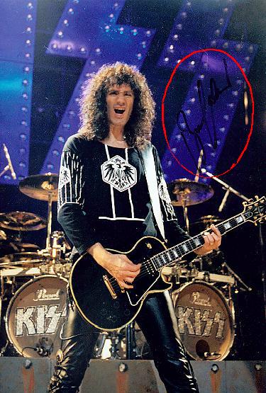 | When my brother was in Australia, he had the chance to see ESP: The Eric Singer Project. Eric Singer is the last replacement drummer KISS had before the reunion happened. He and Bruce Kulick, the last guitarist KISS had before the reunion formed a little band with ex-Motely Crue vocalist, John Corabi and Karl Cochran. He was able to get me signed photos from Bruce Kulick and Eric Singer. I was VERY pleased when he came back from Australia. :) (I've circled the signature on Bruce's pic, since it didn't turn out very well in the scan...) Oh, and since the pagebuilder isn't really cooperating, I'm just going to give you the link to the picture that both Bruce AND Eric signed. :) |