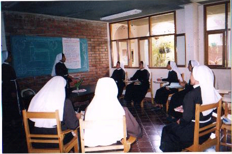 Izquierda: Novicias en el jardín del Noviciado. Derecha: Recibiendo clases en el salón de estudios. |
