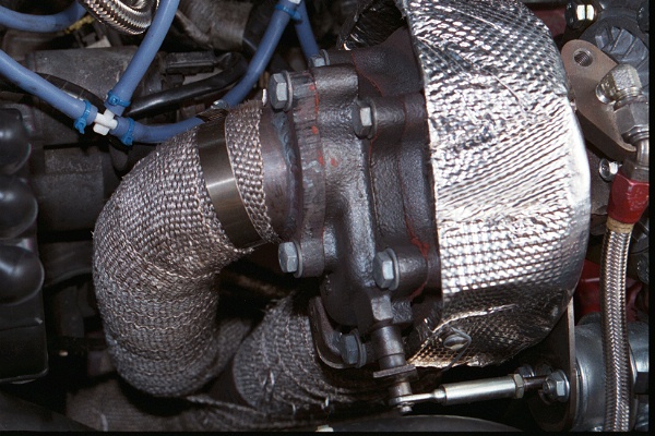 Close Up ON the TURBO. See the down pipe, Collector pipe, waste gate, and oil lines.