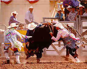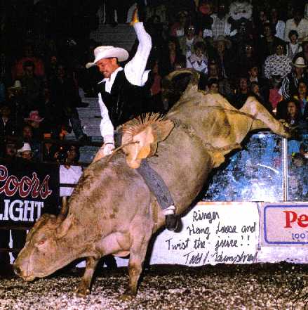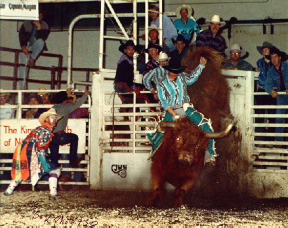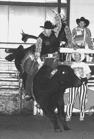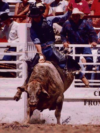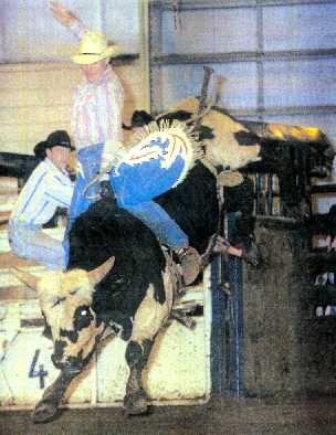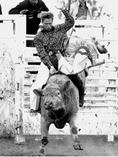BullridingUpper body control and strong legs are essential to riding bulls. The rider tries to remain forward, or “over his hand,” at all times. Leaning back could cause him to be whipped forward when the bull bucks. Judges watch for good body position and other factors, including use of the free arm and spurring action. Although not required, spurring will add points to a rider’s score. As in all the riding events, half of the score in bull riding is determined by the contestant’s performance and the other half is based on the animal's efforts. A bull rider will be disqualified for touching the animal, himself or his equipment with his free hand. This is the scariest event to watch, especially if you know someone competing. Take it from me, watching your friends get beaten into a pulp is not an enjoyable way to spend the afternoon. Bull riding was the subject of the movie "Eight Seconds"(a great movie for the few of you that haven't seen it). The movie chronicled the life of 1987 world champion Lane Frost, who died as the result of a bull riding accident at the 1989 Cheyenne (Wyo.) Frontier Days Rodeo. Which was a huge loss to the world, and rodeo.