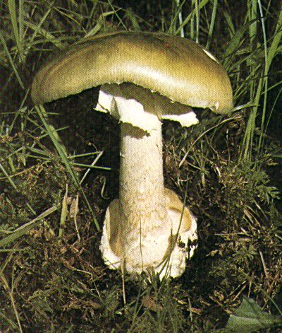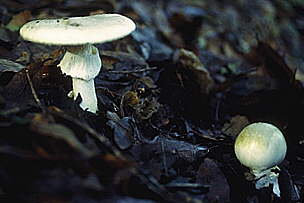 | Above and right: the Amanita phalloides, commonly known as the Death Cap, is probably responsible for more mushroom poisonings than any other because of it's slight resemblance to other edibles like the Lepiota procera, or the Parasol mushroom. According to the National Audubon Society Field Guide to North American Mushrooms,After eating this mushroom, symptoms include severe vomiting, diarrhea and cramps. A remission occurs after a day or so, but by the 3rd or 4th day, serious kidney and/or liver dysfunction occurs and can, without adequate treatment, cause painful death in 5 or 6 days. On the right, you can see remnants of the universal veil and at the bottom of the stalk, the sac-like cup around the base of the stalk. This is one of the more prevelant morpholoical characteristics of this beautiful, but deadly mushroom.* |