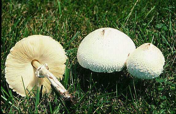| Left: the Chlorophyllum molybdites, or Green-spored lepiota, is an interesting mushroom, mainly because it has greenish gills and produces a green spore print. Gills are free, close, and broad. Also resembles the Lepiota procera, and is a poisonous mushroom that is a severe gastro-intestinal irritant that can cause a few days of violent purging. These things can get really big, and can also appear in fairy rings.* |
