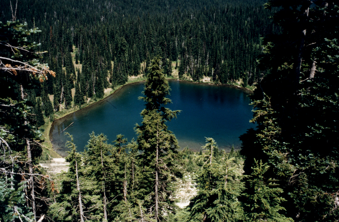 | A beautiful above view of Upper Lake Tipsoo in the Rainier National Forest. Notice the clear blue water. You can see the long resting on the bottom off to the left. |