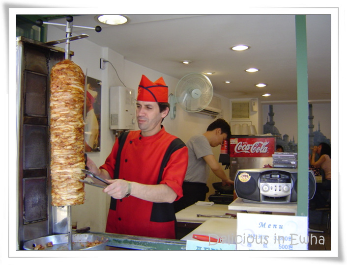 There is a real Turkish kebab place here. Turkish man is cutting the skewered roasted chicken. Though the store is small, you can enjoy Turkish atmosphere. There is only one menu which is chicken kebab. Turkish man is saying "hello" to you kindly. I think the only word he knows is "hello" in Korean. Recommending menus Chicken Kebab 3500Won Restaurant Information Tel. 02-393-2342 Take out available