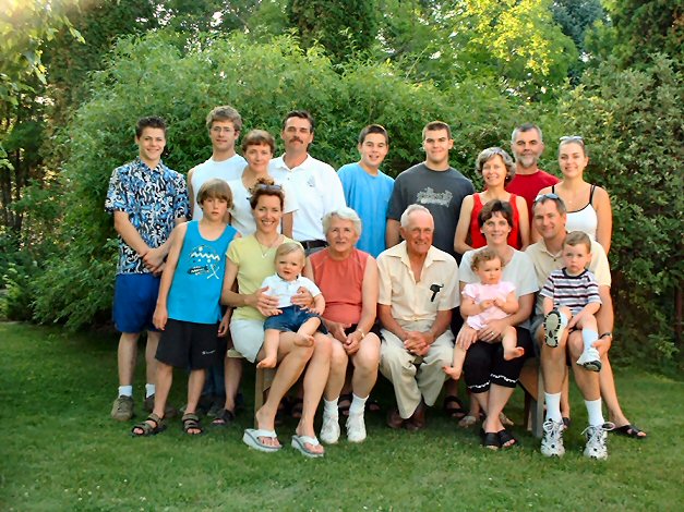 Top left side is Kelly, Garry and their three boys....Kevin, Jordon and Garry are in the back and Kelly and Wyatt in front of them. On the right side is Em's family.....Murphy, Mason, Rick in back and Emily and Ria standing in front of them. On the bench from left to right......Colleen holding Toby, Donna and Kev and next is Jim's family.....Sherri and Jim holding Julia and Nicholas. |