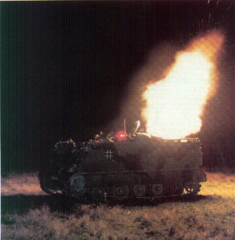 Ein Panzermörser beim Feuerkampf bei Nacht.