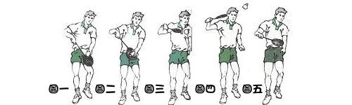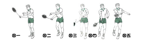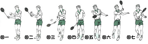 發球技術可分為正手和反手球技術。一般來說,發網前球、發平球、發平高球、發平球和發網前球均可採用正手發球法。基本的技術有:發高遠球、發平高球、發平球和發網前球。 發高遠球:所謂高遠球是把球發的又高又遠,使球向對方後場上方飛去,球的飛行路線與地面形成角度,要大於 45°角,使球在對方場區底線附近垂直下落。如圖: ![]() |