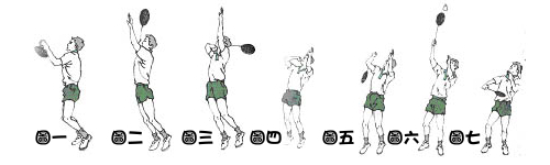 正手擊直線高球和對角線高球:起跳後手腕控制球拍對準來球路線,快速揮拍擊打球的後部,球即沿著直線飛行;若手腕控制拍面擊球托的右下方,球則沿著對角線方向飛行。擊球後,手臂隨慣性自然回收至胸前。如圖: |