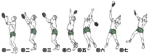 頭頂扣殺球:頭頂扣殺直線球的準備姿勢同頭頂擊高球類似,不同之處在揮拍擊球時,要靠腰腹帶動大臂,協調小臂、手腕的綜合力量形成鞭擊動作,全力往下方擊球,拍面與水平面的夾角小於90° 頭頂扣殺對角線的動作方法基本同上,只是擊球時要全力向對角線方向擊球才行。如圖: |
