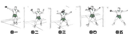 反手推直線球:在網前較高的擊球點上,以反手握拍法,用椎擊的方法向對方底線擊出弧度較平,速度較快的球.其擊球動作是: 用反手握拍法,前臂伸時稍外旋,手腕由外展至伸直閃腕,中指、無名指和小指突然握緊拍柄,拇指頂壓球拍,往前揮拍,推擊球托的左側面。( 如圖 ) |