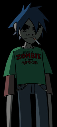 Crawley Age: 23 Influences: Butorphanoi, Tartrate, Phill Oakey, Lucio Fulci Hit twice on the head when young, 2D is a sweetheart with a blank sheet of paper where a brain should be. He has really good hair. People think he's cool and enigmatic but he's just got a migraine. 2D idolises Murdoc, who, he feels, saved his life. Keyboard wizard, melodica maniac, graffiti compulsive and the perfect pin-up product. Voice like an angel, arse like a satsuma. Mind full of zombies and painkillers. Says nothing controversial. Says nothing much at all. Loved by everyone (except the green eyed Murdoc), 2D has legions of lady followers and would make a good boyfriend if only he'd wake up.