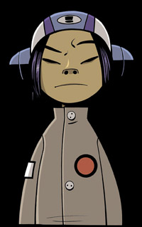 Osaka Age: 11 Influences: Haiku poetry, Loa Zi, Richie Sambora Noodle arrived in a crate. She's a kick ass riffmeister, the Asian axe princess. Doesn't speak more than a word of English, and that word is "Noodle." Martial Arts expert, little ice maiden, she looks at the world through unfazed eyes. Usually found with Russel. Special zen bond with 2D. Tickled by Murdoc's desperation. Irrepressible. Inscrutable. Irresistable. Likes: Power Puff Girls, Tomagatchi pets, Pokemon, Yo-yo's, her new radio headphone hat, rice and noodles.
