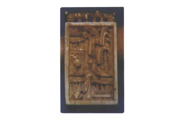 明代象牙微雕9檔算盤,背雕人物樓閣圖,珠可撥動。 |