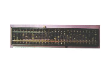 木框一、四、一牛角菱珠27檔雙梁正負數算盤。 |