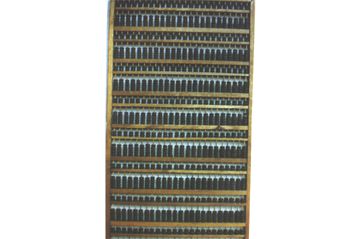雙層算盤,全木一、四、一、四圓珠三梁13檔雙層算盤。 |